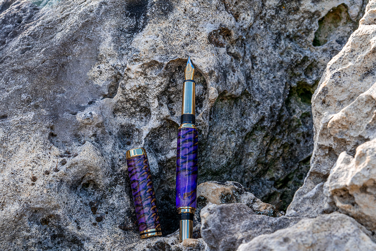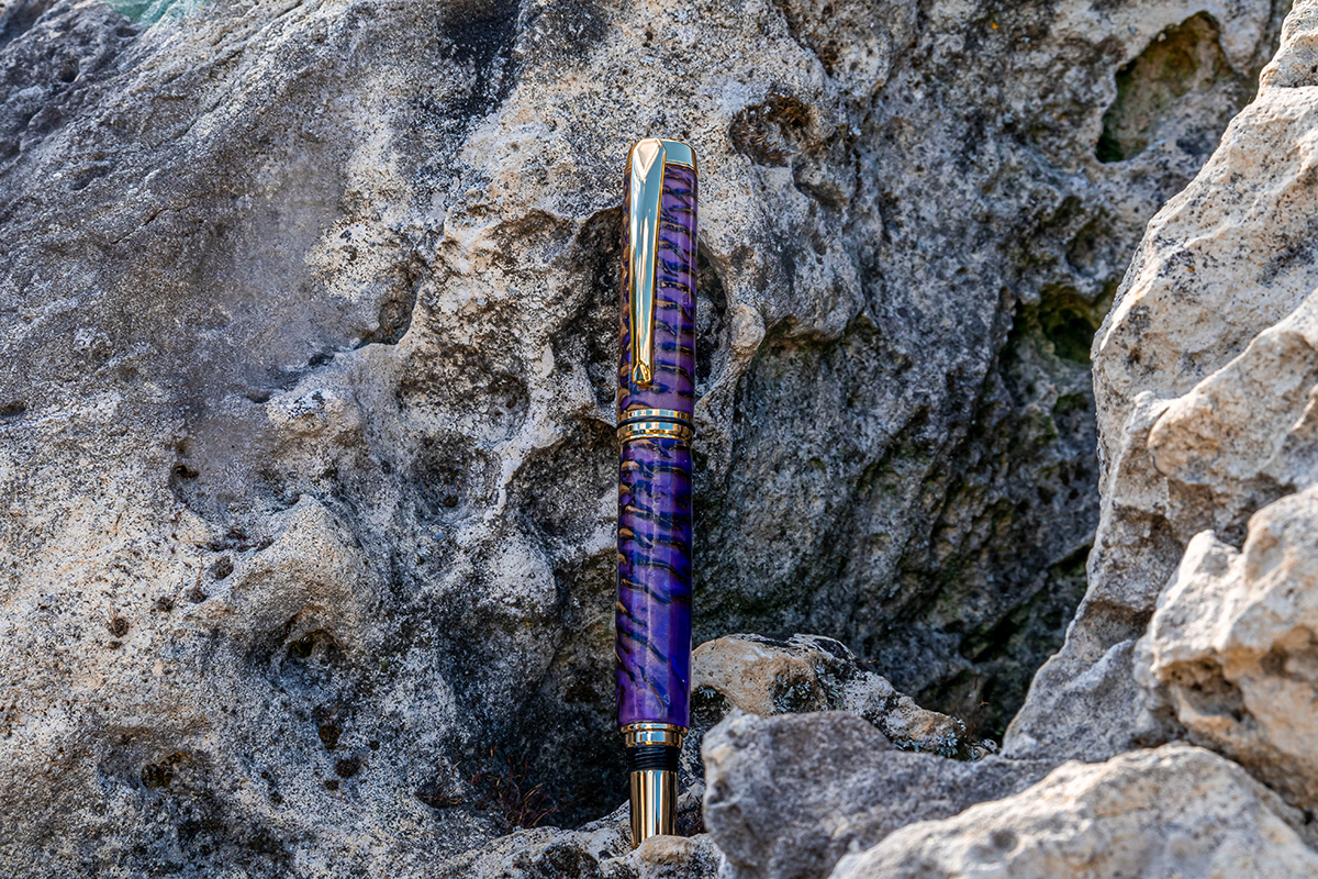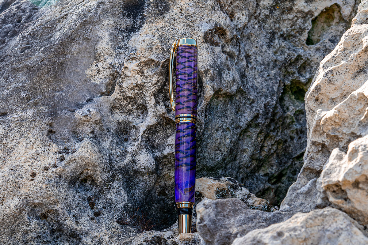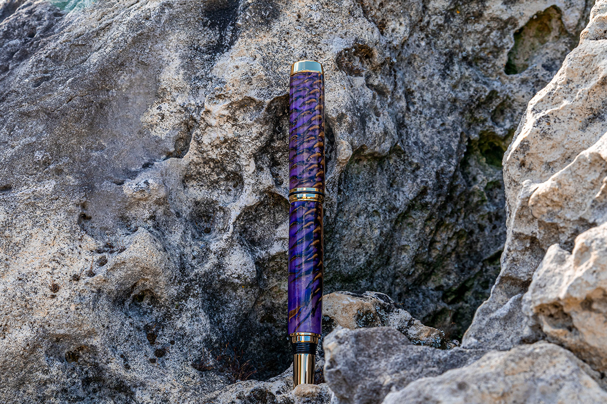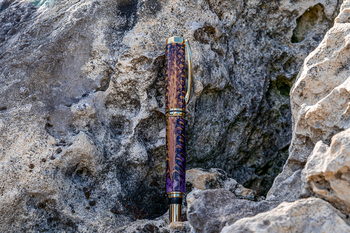 Baron Füller 24ct vergoldet, Tannenzapfen in violettem Epoxidharz vergossen.