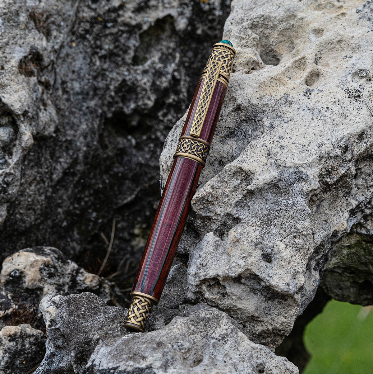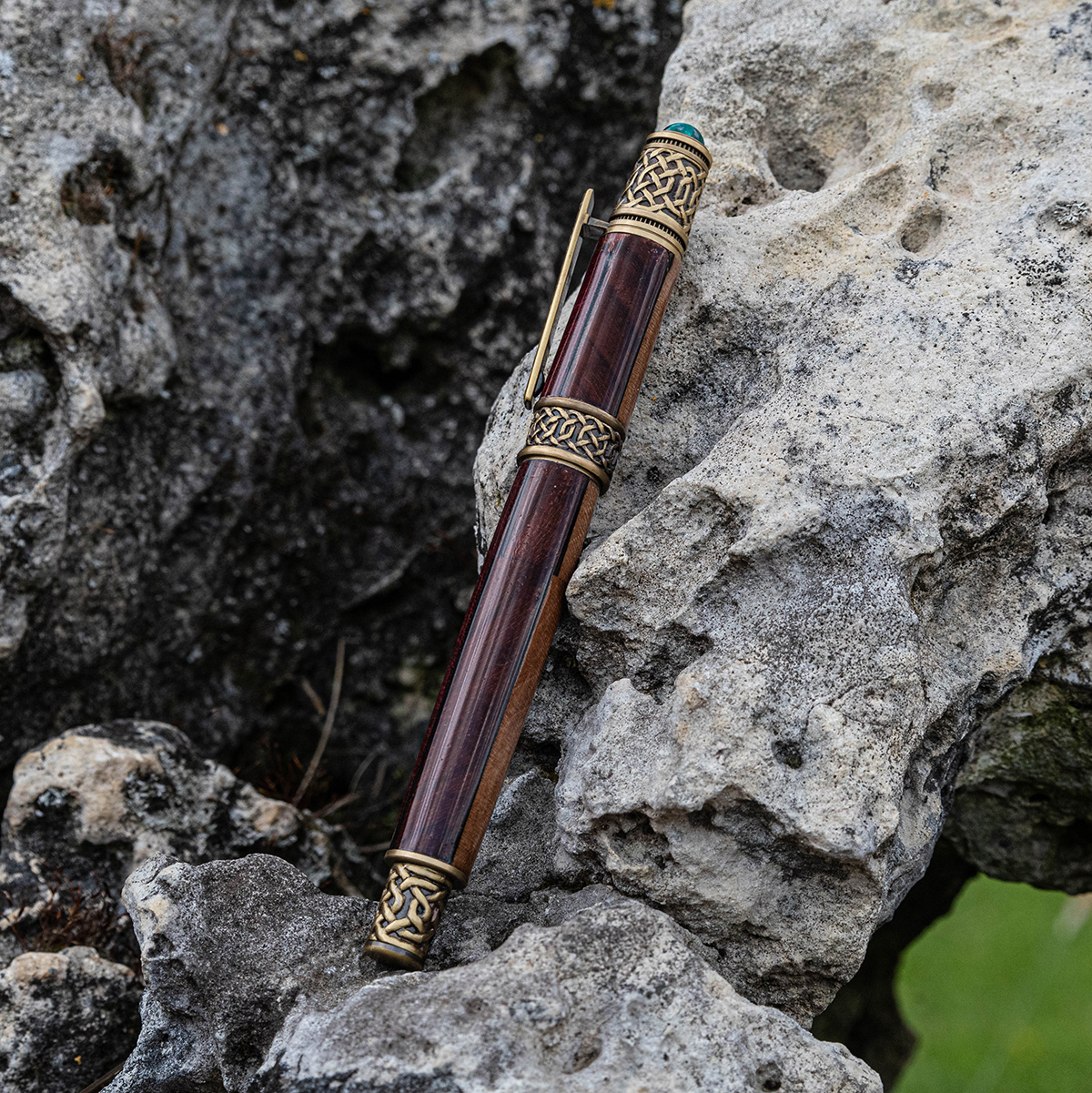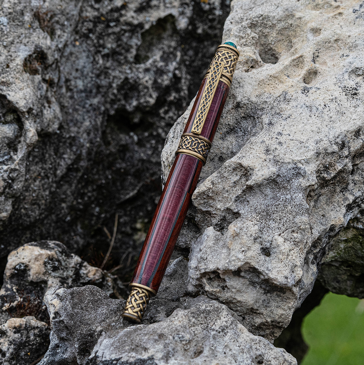 Die chemisch abgedunkelten massiven Messing-Komponenten simulieren altes Messing. Das Ergebnis ist wunderschön und eine lang anhaltende braune Beschichtung mit goldenen Untertönen. Der rustikale, authentische Look des antiken Messing wirkt schön mit jedem Holz und besonders gut mit grünen Acryl. Die Muster beinhallten unter anderem den keltischer Knoten.