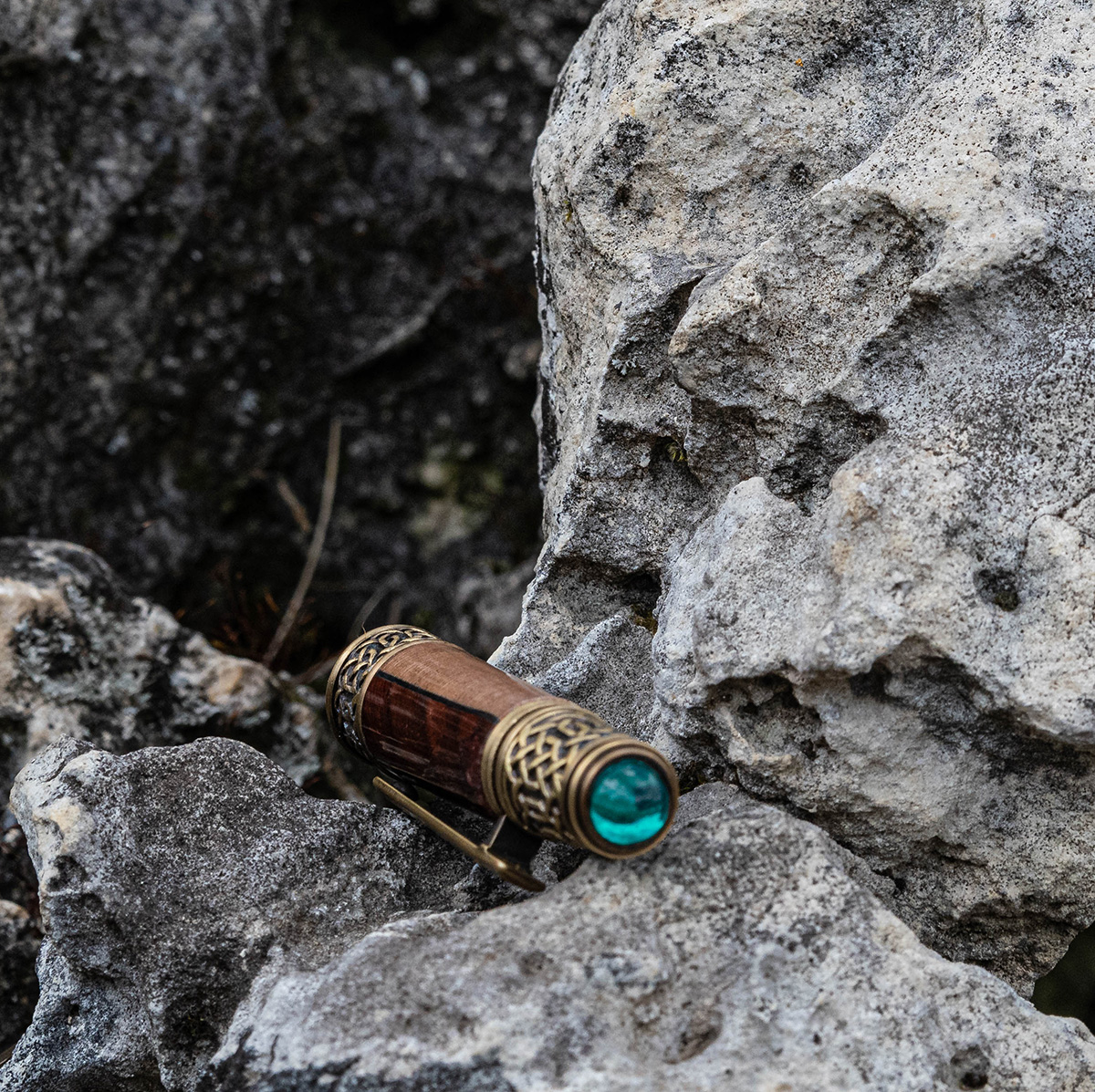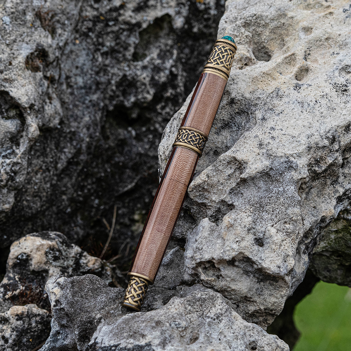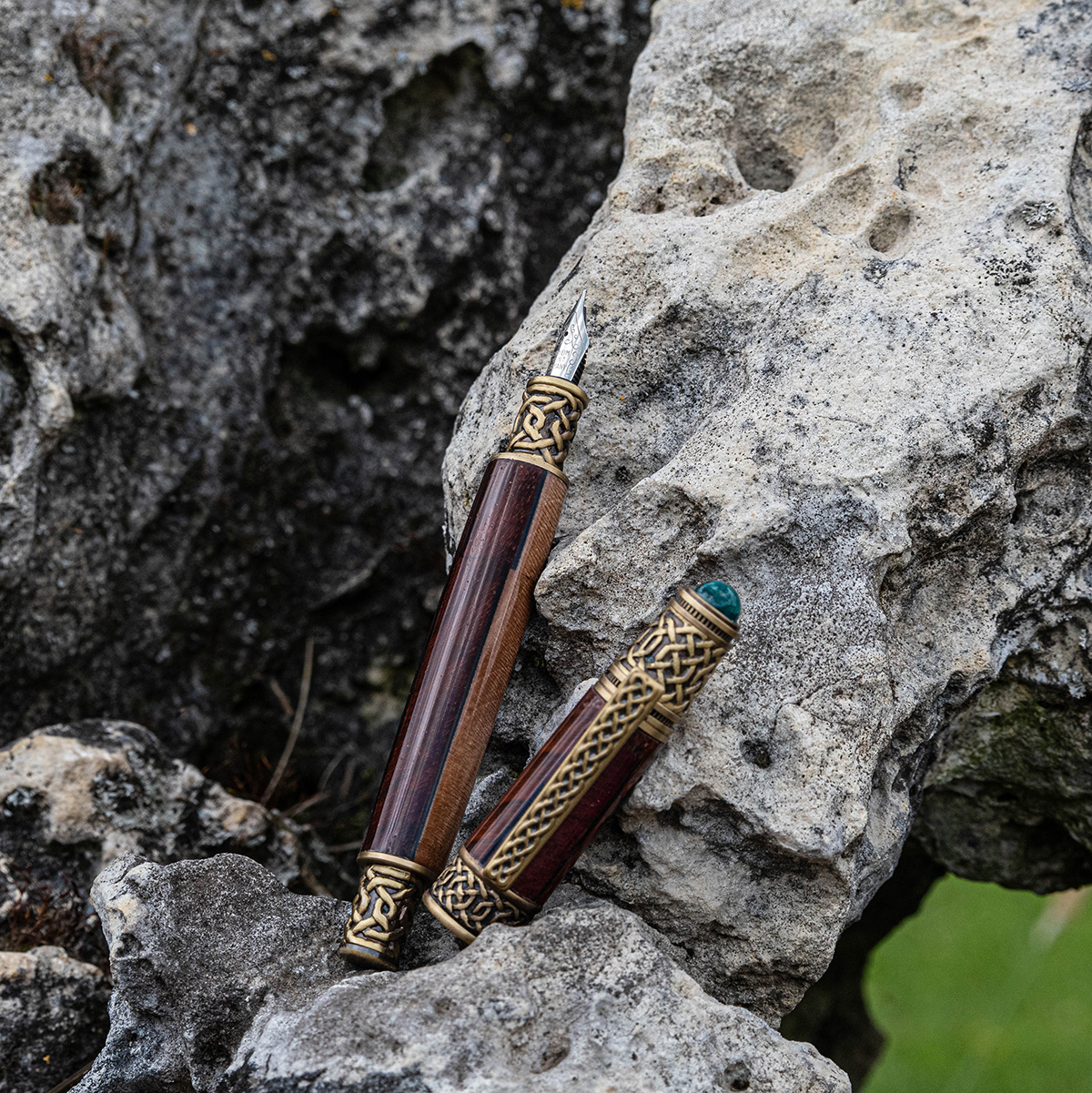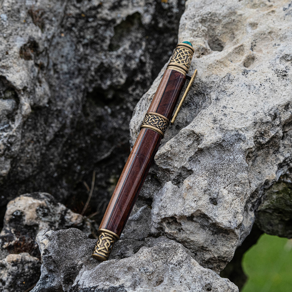 Die chemisch abgedunkelten massiven Messing-Komponenten simulieren altes Messing. Das Ergebnis ist wunderschön und eine lang anhaltende braune Beschichtung mit goldenen Untertönen. Der rustikale, authentische Look des antiken Messing wirkt schön mit jedem Holz und besonders gut mit grünen Acryl. Die Muster beinhallten unter anderem den keltischer Knoten.