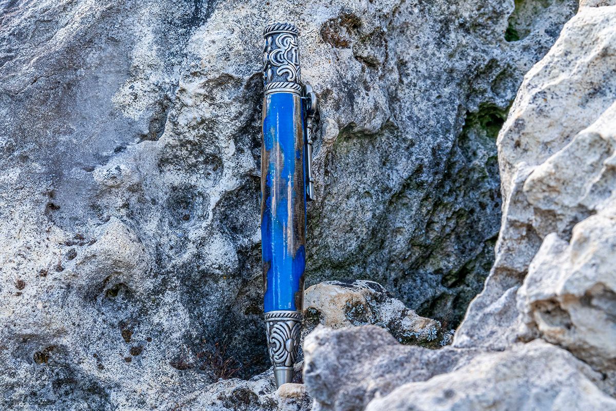 Handgedrechselter Kugelschreiber Holz: Wurmholz Fichte, stabilisiert und in blauem Epoxid vergossen Skeleton KeyTwist Pen Optik in Antik Zinn Dieser klassisch gestaltete Stift basiert auf der Idee eines Skelettschlüssels, der seit über zweitausend Jahren verwendet wird. Die Schlösser wurden vor Jahrhunderten entworfen und waren bis zum Beginn des 20. Jahrhunderts weit verbreitet. Viele altmodische Skelettschlüssel wurden in einer Zeit hergestellt, in der aufwendige Metallarbeiten geschätzt wurden. Der Clip ist mit aufwändigen und dekorativen Verzierungen erstellt. Das antike Zinn-Finish wurde so bearbeitet, dass es den raffinierten Glanz von abgenutztem Zinn simuliert. Die authentische Patina und die natürliche Verdunkelung heben die Details hervor und schaffen ein einzigartiges Gefühl mit einem ganz brsonderem Charme. Sehr schwerer massiver Stift ! Unikat ! handgefertigt Drehmechanik mit Großraummine ! Sehr Hochwertige Mechanik Sie erhalten wie immer, genau den abgebildeten Stift !!